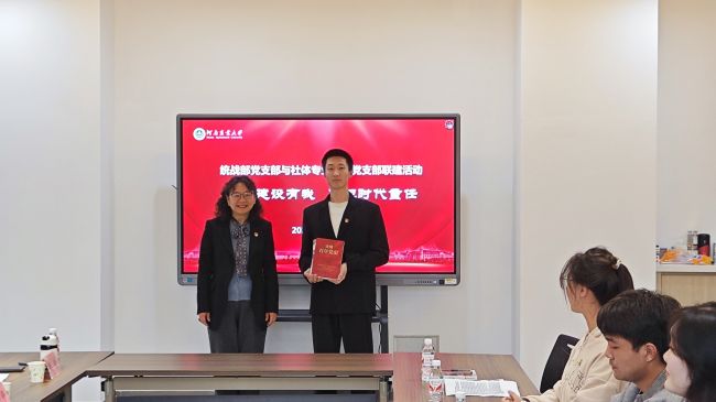 陈玲代表校党委统战部向与会学生党员赠送了《读懂百年党史》《青春之歌》等书籍。