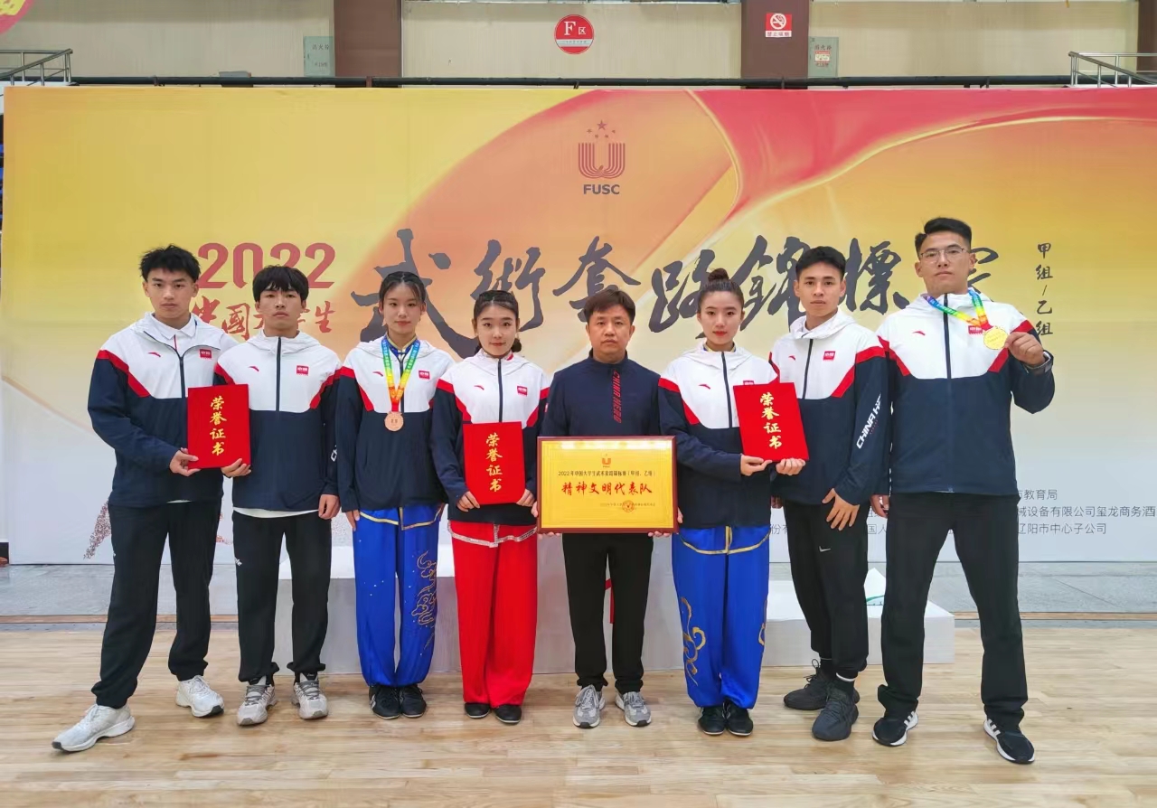 学校派出由快猫视频 院长董勇任领队、樊艺勇老师任主教练、王献斐老师任助理教练的武术代表队带领7名运动员赴辽宁参赛。经过4天激烈角逐,武术队取得男子软器械第一名、女子通臂拳第三名以及其他项目第四名、第五名、第六名等优异成绩,樊艺勇老师荣获优秀教练员,快猫视频 获得了体育道德风尚运动队与精神文明单位,实现了比赛成绩和体育道德风尚双丰收。赛场上,队员们顽强拼搏,充分展现我校大学生积极阳光的健康心态与昂扬向上的精神风貌。