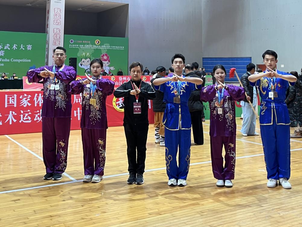 武术代表队报名参赛,共经过12场的激烈角逐,我校武术健儿及留学生在赛场中不畏强手,秉持顽强拼搏、勇攀高峰的意志和信念,一举斩获3金4银9铜的佳绩,樊艺勇老师获优秀教练员称号,樊琳琳、武凌峰两名同学获优秀运动员称号。