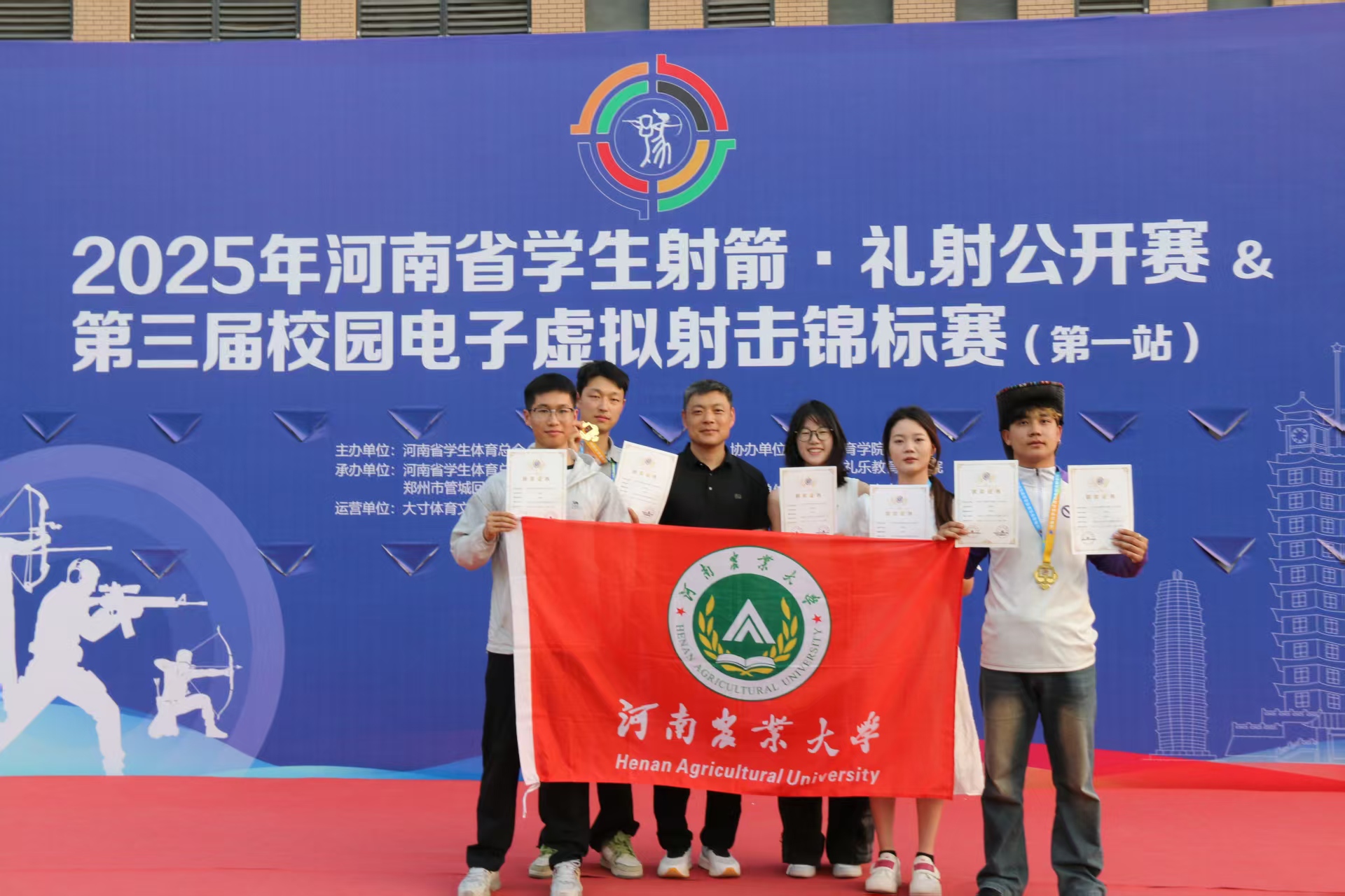 院长唐大鹏为领队,指导教师王献斐为教练带领我校射箭队以精湛技艺和顽强拼搏的精神,斩获多项冠军!男子传统弓个人赛中,马雨航同学力压群雄,摘得30米冠军;杜光旭同学奋力拼搏,夺得18米冠军