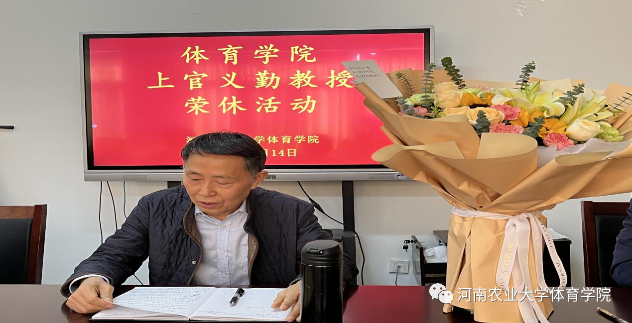 活动由教学副院长唐大鹏主持,他首先介绍了上官义勤教授的工作经历和优秀教学业绩。院长董勇代表学院致辞并为上官义勤教授颁发了荣誉证书并送上献花,表达了诚挚的敬意和祝福。随后,上官义勤教授发表了从教四十年感言。他回忆起在体院工作的点点滴滴,言谈中饱含着爱党爱校的情怀和对教育事业的忠诚与热爱。