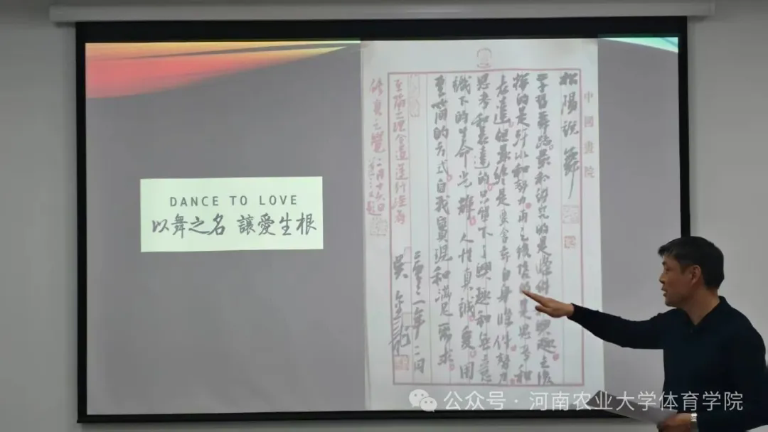 最后,王献斐以“以舞之名,让爱生根”八个字总结收尾,为这场兼具思想深度与实践价值的讲座画上圆满句号。整场讲座干货满满,不仅打破了师生对舞蹈艺术的固有认知,更为体育艺术教学与创作注入了新的思路与活力。