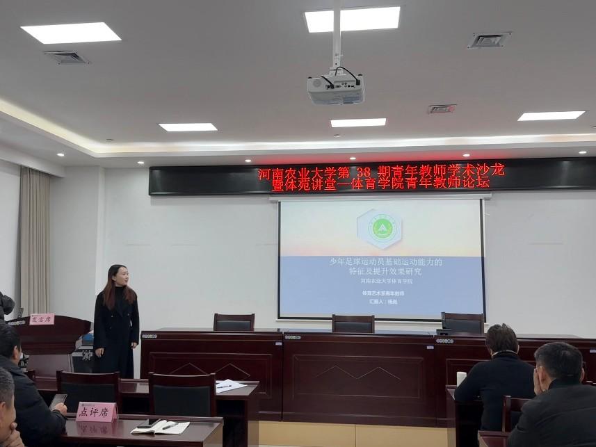 两位青年教师分别就各自的研究题目进行了深入的汇报。杨岚的研究报告是关于“足球运动员基础运动能力的特征及提升效果研究”。她的研究揭示了足球运动员在不同训练阶段的运动能力特征,并提出了有效的提升方法,这对于指导足球训练具有重要的实践意义。