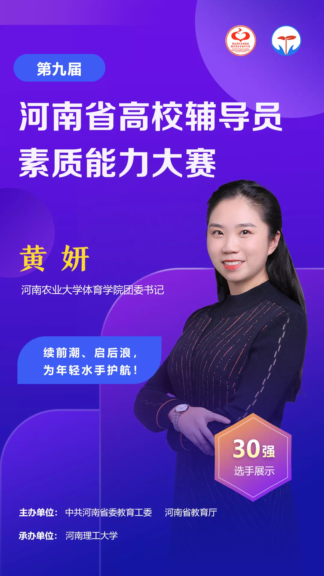 第九届全省高校辅导员素质能力大赛是河南省委教育工委、河南省教育厅为不断提升高校辅导员的理论水平、职业能力和专业素养,推动全省高校思想政治工作高质量发展而开展的一项重要赛事,全省130所高校的133名辅导员参加了本次大赛。比赛项目设置为基础知识测试、案例研讨、谈心谈话三个环节,经复赛比拼,共有30名选手进入决赛,快猫视频 黄妍老师以扎实的理论储备和出色的临场表现以总分第二顺利晋级决赛,并荣获一等奖。